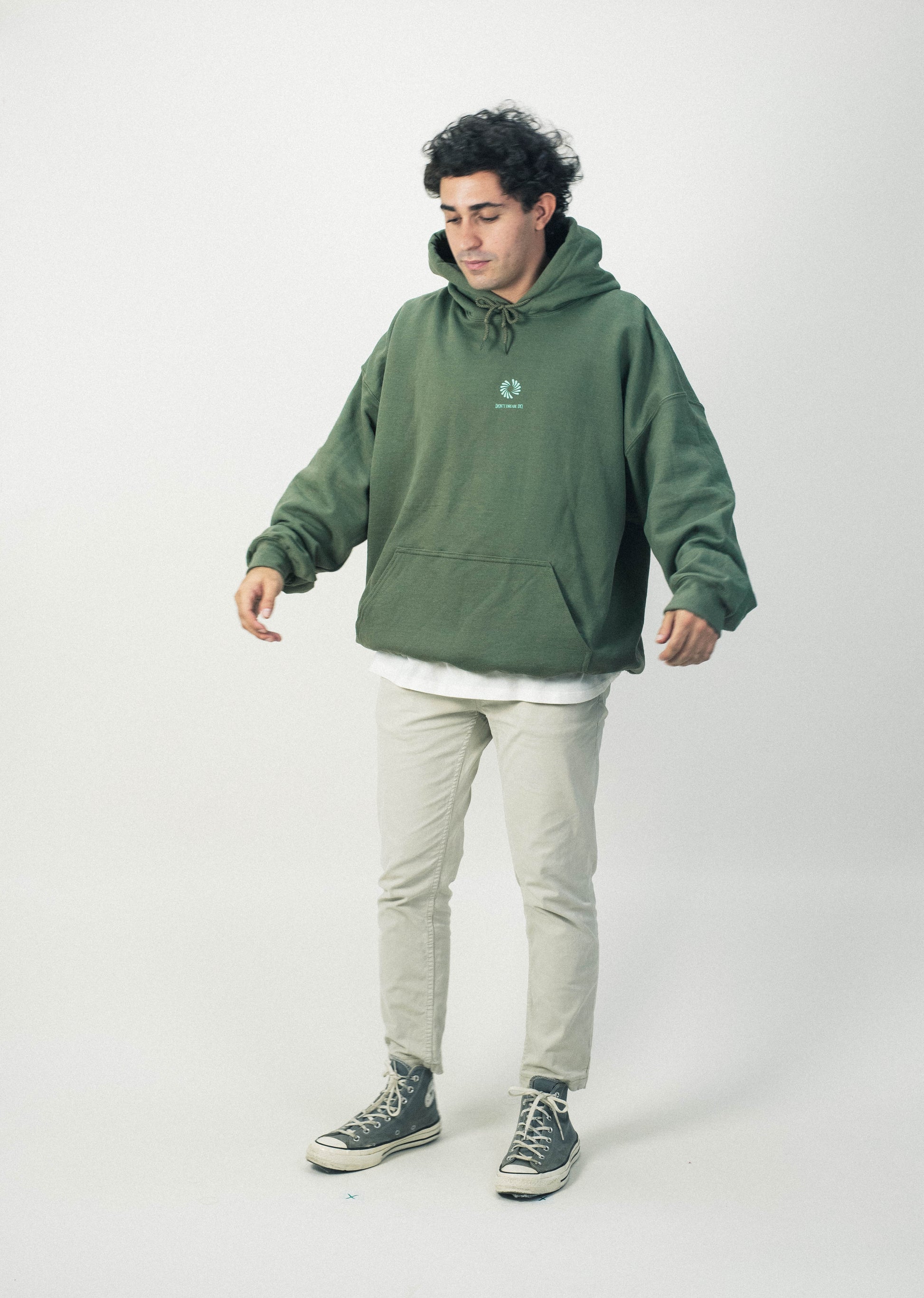 Sudadera color verde. Serigrafía en la parte delantera y trasera en grande.